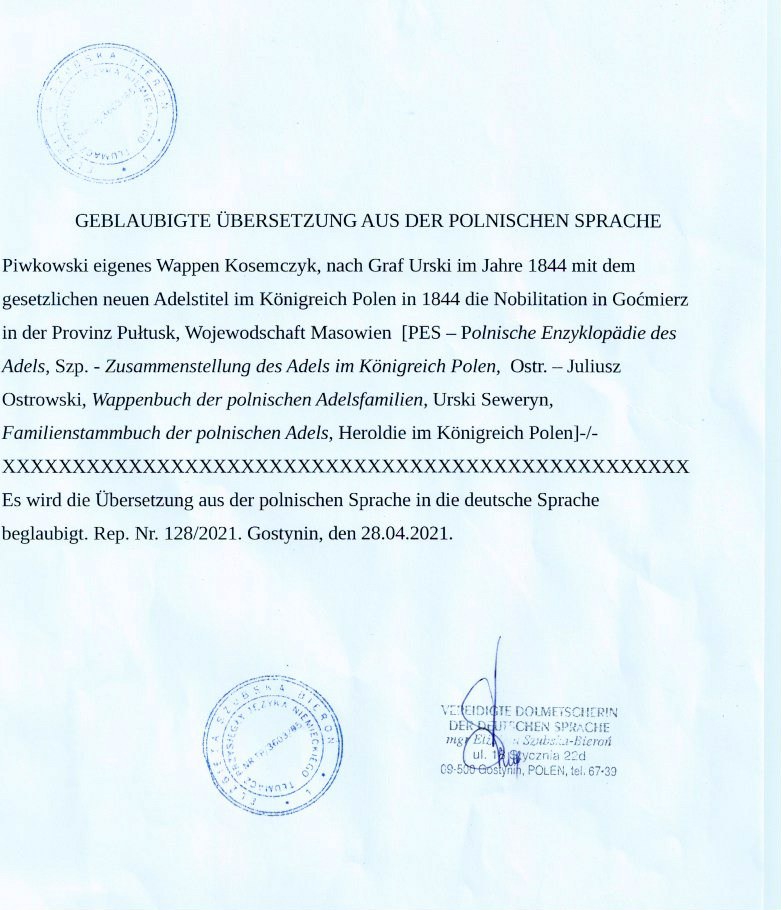 Bekam 1844 erneut den Adelstitel im Königreich Polen